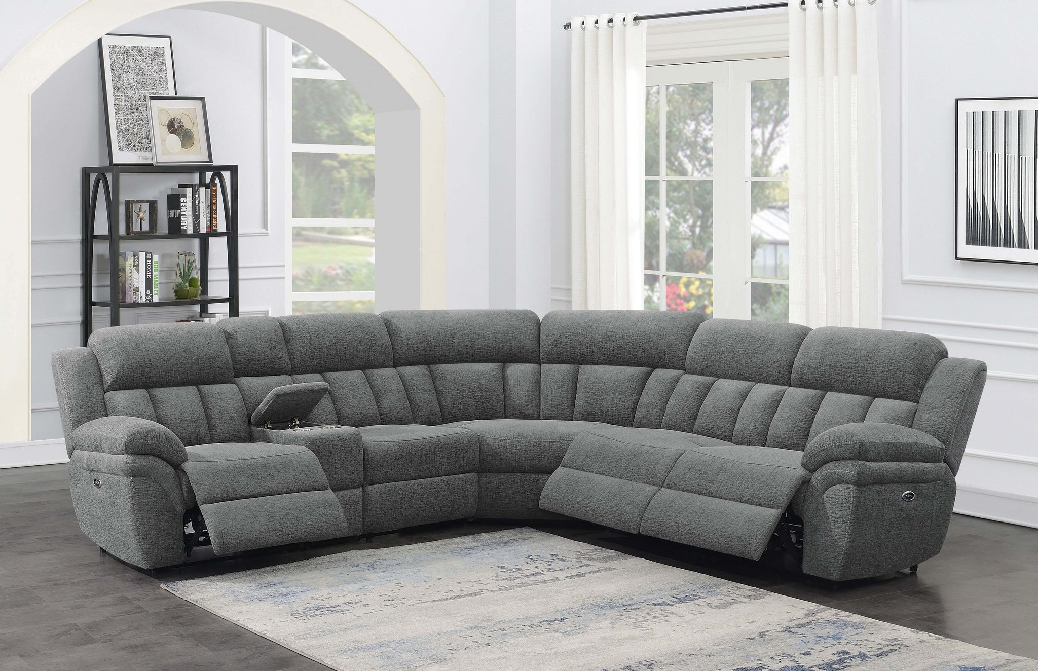 Designed for flexibility and comfort, this six-piece modular power sectional transforms your living space into the ultimate entertainment hub. Upholstered in soft charcoal performance chenille, it features three power reclining seats with wall-hugging mechanisms to maximize floor space. A lift-top console adds hidden storage, built-in power outlets with USB ports, and two stainless steel cup holders with removable inserts. Supportive pocket coil seating and a cool gel memory foam topper ensure long-lasting comfort._x005F_x000D_ Key Features: • Six-piece modular power sectional in charcoal performance chenille upholstery • Three power reclining seats with wall-hugging mechanism for space efficiency • Lift-top console with hidden storage, two cup holders, and integrated outlets • Supportive pocket coil seating ensures comfort and long-lasting durability • Includes one-inch cool gel memory foam topper for enhanced seating support • Spacious design provides seating for family gatherings or entertainment areas