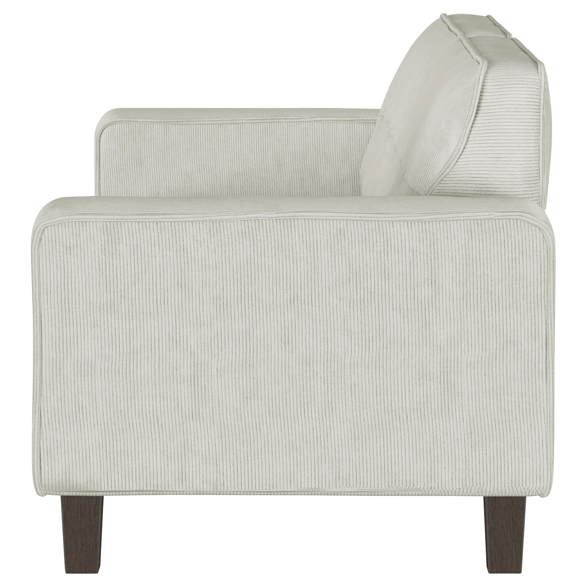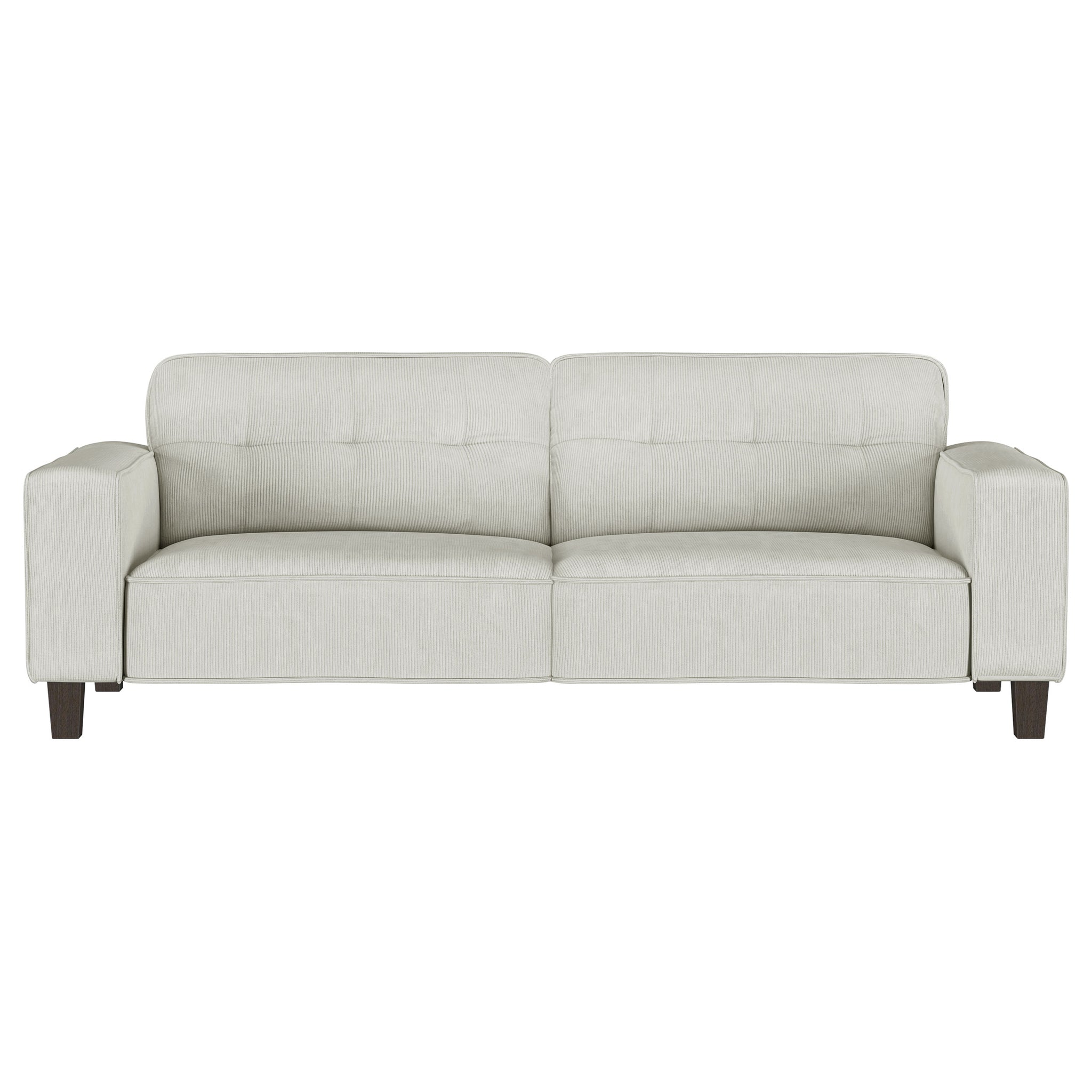 Create a stylish and infinitely comfortable and inviting living space with a modern sofa. Its timeless stance features wide track arms that pair perfectly with plush cushions for an indulgent seating experience. Great for game days, entertaining, or evenings at home, the sofa features plush upholstery with corduroy inspired texture that adds depth and dimension. Back cushions are plush and tufted, offering a grid pattern that's clean and refined. Tapering feet complete the look, offering height that creates an airy finishing touch perfect for modern living. Key Features: • A modern sofa offers inviting flair with soft upholstery in a lovely neutral hue • Textured corduroy-style upholstery is extra plush for a cozy and inviting touch • Biscuit tufted back cushions create a stylish touch of texture and dimensionality • Wide track arms define a clean-lined silhouette that offers versatile style in any living space • Tall, tapering wood legs create light, airy lift, perfect for a modern living space • Seats feature sinuous springs and coils for optimal comfort and support