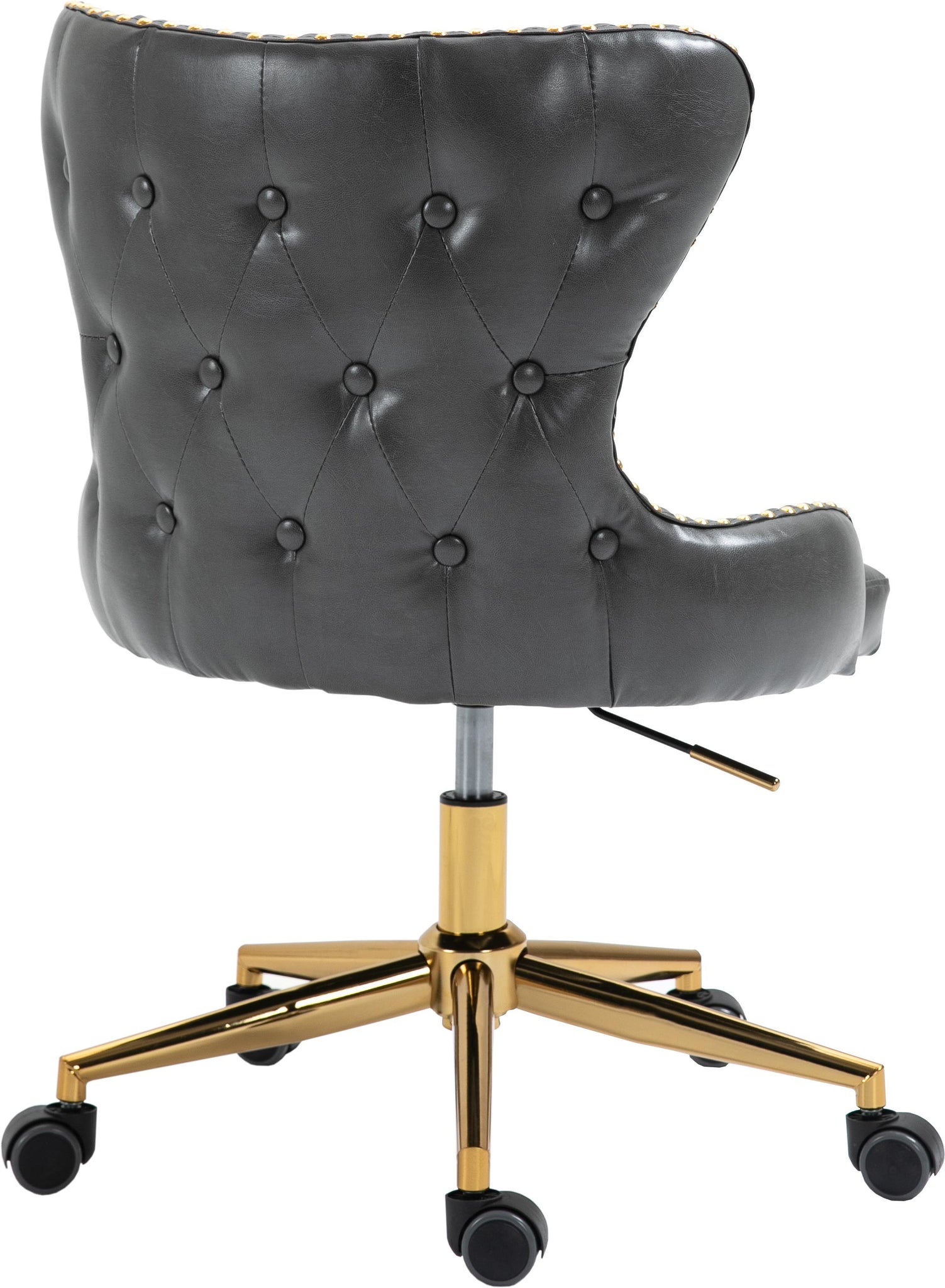 Sit back and take it easy in this Hendrix faux leather office chair. Its soft grey faux leather looks so real, no one but you will know it���s not. A rich gold base and coordinating nail head trim hardware adds a touch of elegance to this comfortable chair. Its swiveling function lets you easily turn at your workstation to perform different tasks, and the seat height is adjustable, so you can quickly find the best and most comfortable position.