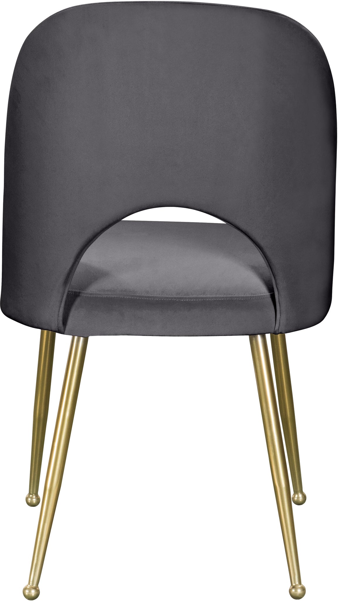 Sit for hours on the Logan grey velvet dining chair, no matter what may be the task at hand. Both the back and seat are both well-cushioned with foam, and the back has a semicircular cutout in the lumbar area for your comfort. The chair has a wooden frame, and is supported by four brushed gold legs, with decorative balls for feet. Contemporary in style, this chair goes well with any table or d?�cor scheme.