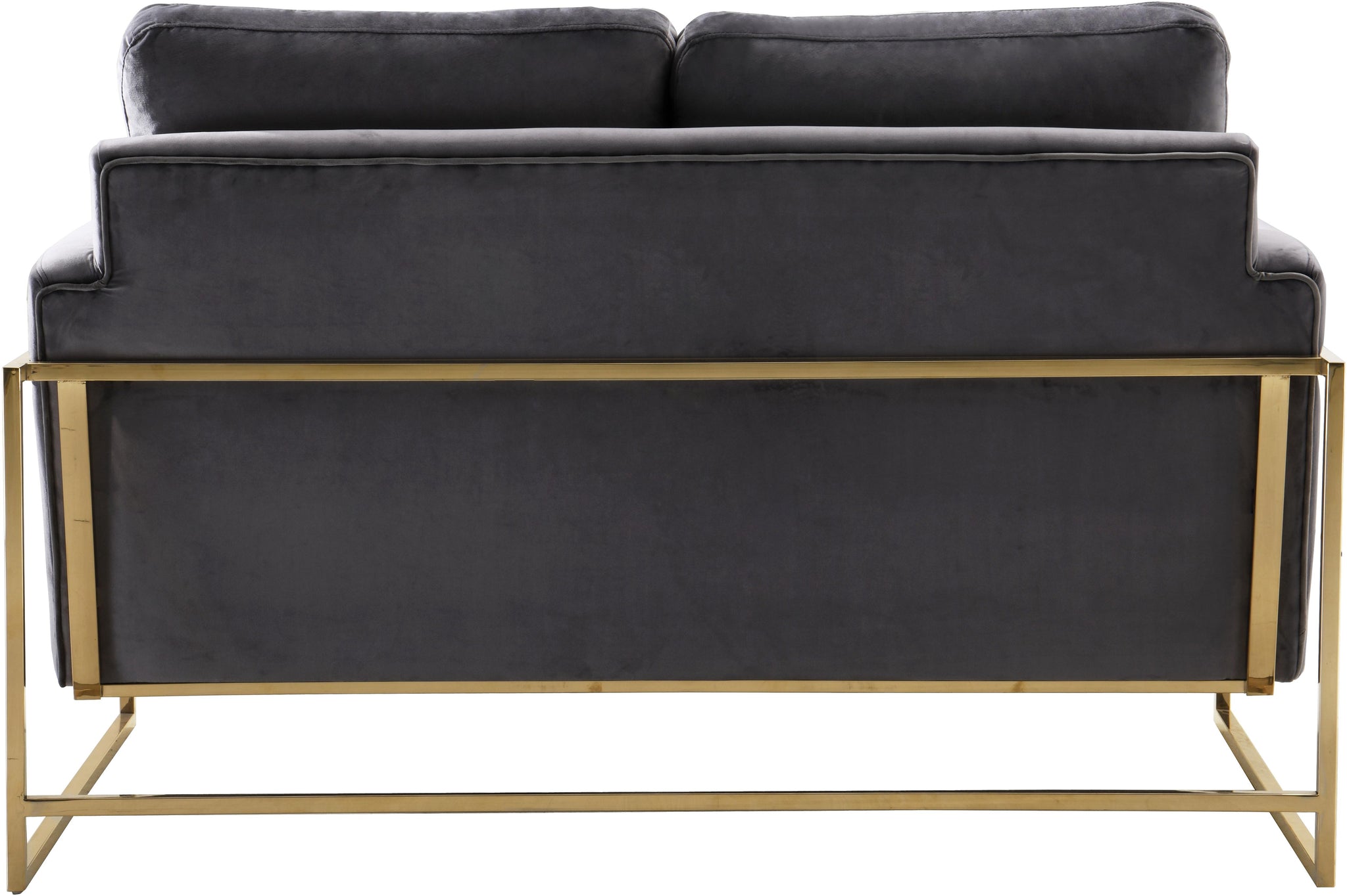 Seat guests in complete luxury on the Mila Grey Velvet Loveseat. The bold grey color makes a statement in your space, and the gold stainless steel frame ensures sturdy support while you relax or take a nap. It comes with two throw pillows that cradle your sides as you sit, elevating its comfort level. Lots of clearance beneath this sofa makes cleaning and vacuuming a breeze. Buy it alone or pair it with the matching sofa or chair!
