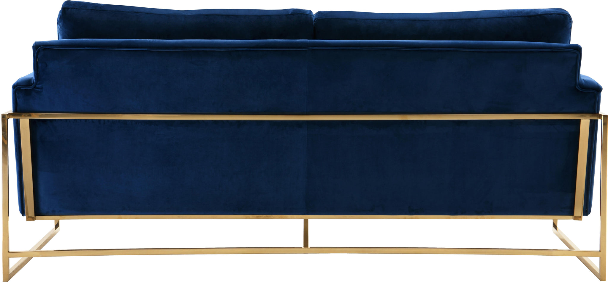 Seat guests in complete luxury on the Mila Navy Velvet Sofa. The bold navy color makes a statement in your space, and the gold stainless steel frame ensures sturdy support while you relax or take a nap. It comes with two throw pillows that cradle your sides as you sit, elevating its comfort level. Lots of clearance beneath this sofa makes cleaning and vacuuming a breeze. Buy it alone or pair it with the matching loveseat or chair!