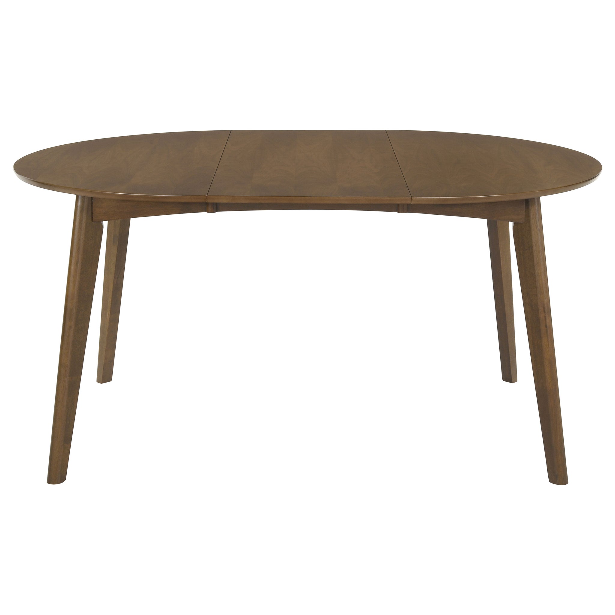 The Malone Collection includes this extendable modern dining table. Solid wood construction and angled legs allow for durability against daily use. Removable leaf extends for an oval shape that welcomes a close-knit gathering. Finished in dark walnut for a condo in the city or a log cabin in the mountains. Pull up a chair with cushioned seating and enjoy a home-cooked meal. Key Features: • Oval dining table with smooth rounded edges and a mid-century modern silhouette • Dark walnut finish enhances the warm wood tones of the tabletop and legs • Removable leaf transforms the table from compact to extended oval shape • Angled legs add a retro-inspired design detail with everyday functionality • Constructed from solid rubberwood, engineered wood, and walnut veneer • Assembly required with clean profile ideal for both small and open dining spaces